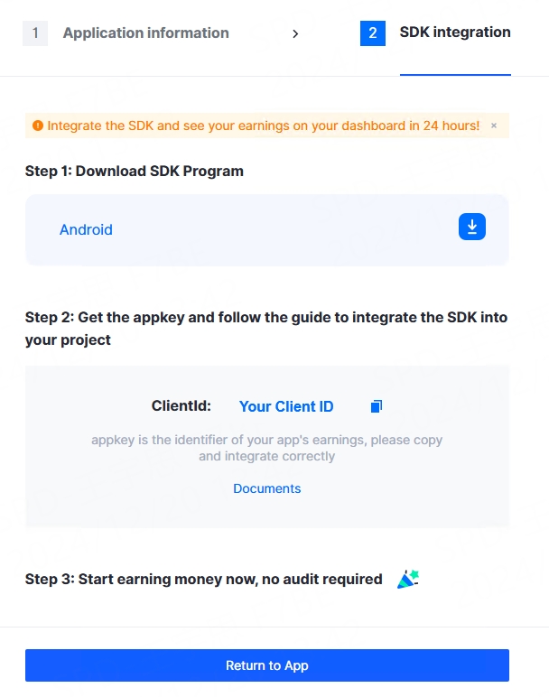 После того, как вы ввели информацию, вы можете напрямую загрузить файл SDK для соответствующей платформы и просмотреть идентификатор клиента вашего приложения, что также означает, что ваше приложение было успешно создано.